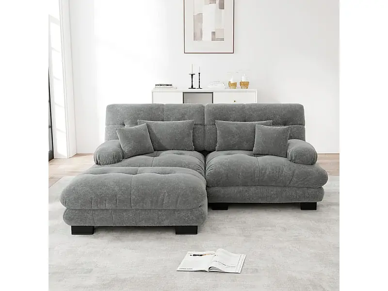 Beliebt Ecksofa 2-Sitzer aus Chenille-Stoff, mit 4 Kissen, abnehmbarer Hocker, DIY-Kombination, 220x145x81cm, Grau