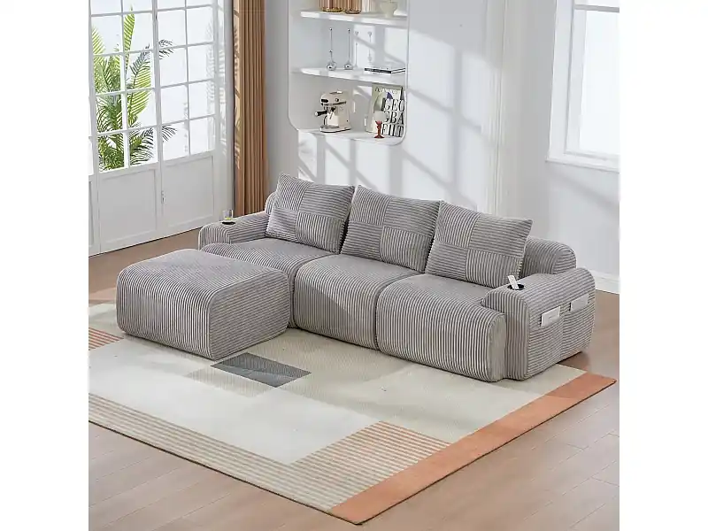 Bestpreis Modulares 3-Sitzer Ecksofa Rippensamt, Hocker, Getränkehalter und Seitentasche, 268x174x80cm, Hellgrau