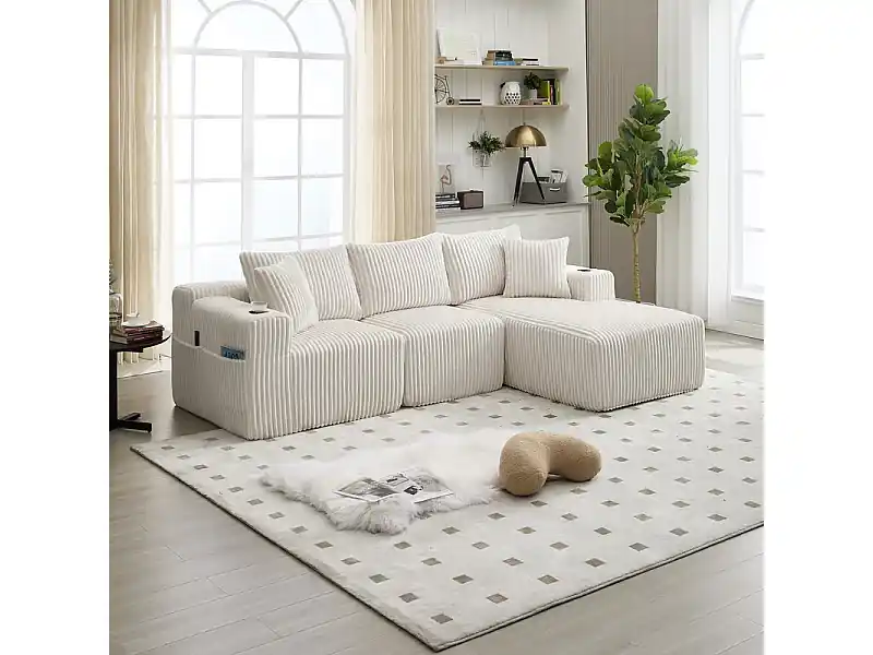 Direkt Vom Hersteller Modulare Eckcouch 3-sitzer, aus Cord, mit Getränkehalter, Kissen und Seitentaschen, Liege 118cm, Beige