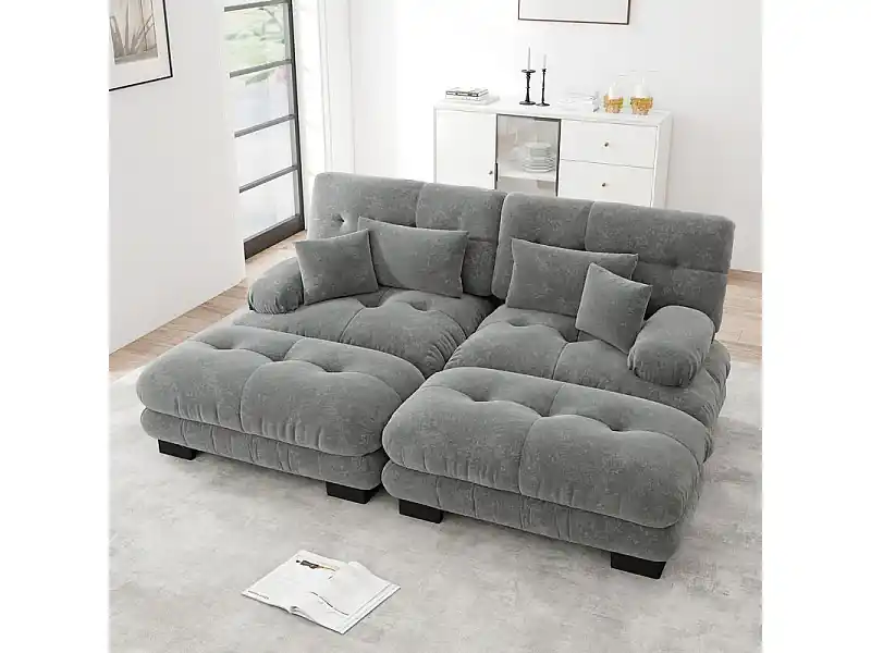 Ecksofa 2-Sitzer + 2 Hocker – mit 4 Kissen – Chenille Stoff grau – 220x145x81cm Ausverkauf