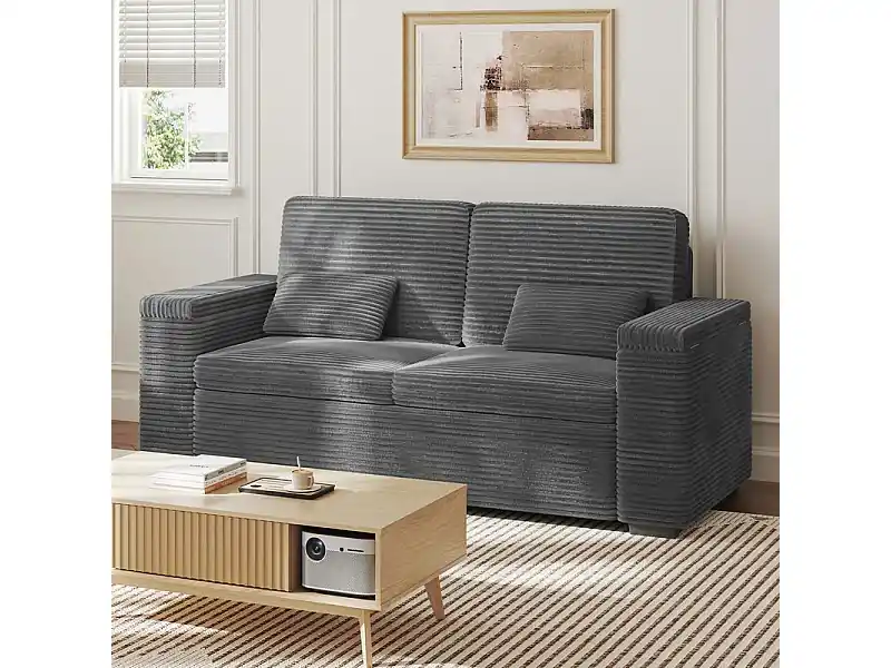 Gerades 2-Sitzer Sofa in Rippensamt Grau – mit Stauraum-Armlehnen – 180x74x84cm Highlight
