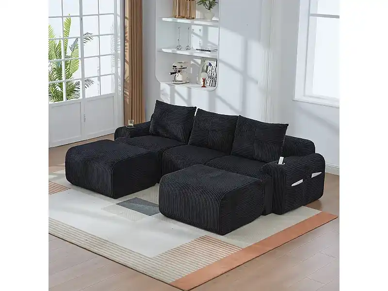 Kracherpreis Modulares Ecksofa Rippensamt, Getränkehalter, 2 Hocker und 3 Kissen, 268x174x80cm, Schwarz