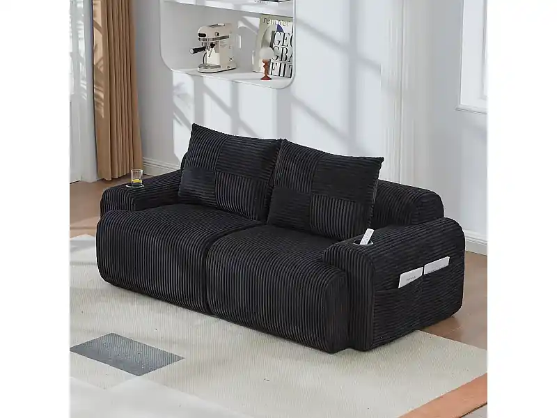 Modulares 2-Sitzer Sofa Rippensamt, Getränkehalter und Seitentasche, 200x99x80cm, Schwarz Zertifiziert