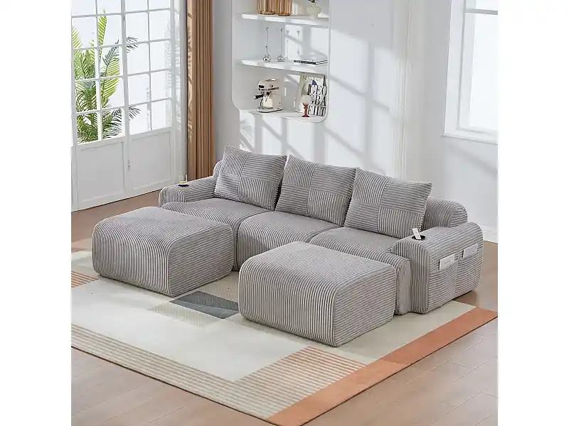 Modulares Ecksofa Rippensamt, Getränkehalter, 2 Hocker und 3 Kissen, 268x174x80cm, Hellgrau Bestpreis