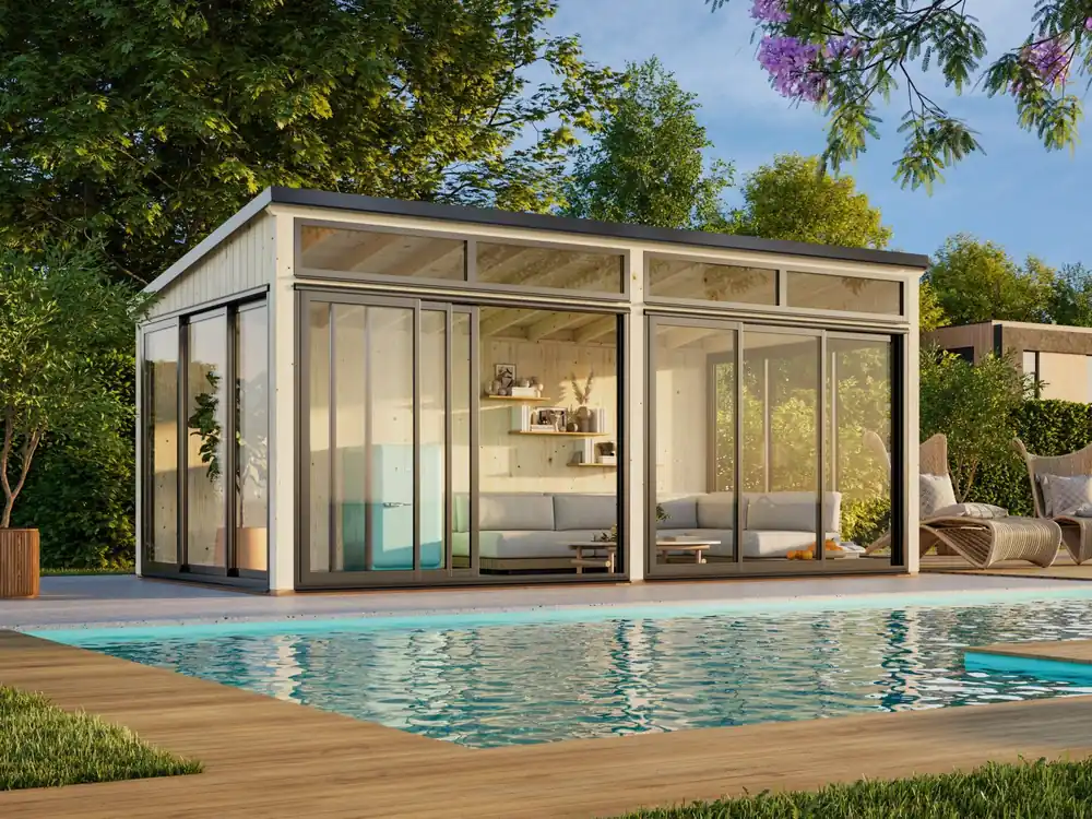 Das Gartenzimmer Saga 16,2 m² Slide Plus vereint moderne Architektur mit einer langlebigen, äußerst stabilen Holzbauweise. Die Konstruktion basiert auf 120 × 120 mm starken Leimholzbalken, die dem Gartenhaus eine beeindruckende Tragfähigkeit und Formstabilität verleihen. Die Rückwand besteht aus vorgefertigten 88‑mm‑Wandelementen mit integrierter Dampfbremssperre und wird außen durch 18 mm starke Fassadenbretter ergänzt – ein Aufbau, der sowohl energetisch als auch optisch überzeugt. Das Dach wird aus 19 mm Nut‑und‑Feder-Dachbrettern gefertigt und fügt sich harmonisch in das klare, moderne Design ein. Die dreiseitige Verglasung besteht aus wartungsfreien Aluminium-Schiebetüren, ausgestattet mit 24 mm Doppelverglasung, einer Höhe von 200 cm und einer Mehrfachverriegelung für zusätzliche Sicherheit. An der Stirnseite sorgen feststehende, doppelverglaste Oberlichter mit Aluminiumrahmen für noch mehr Licht und ein offenes Raumgefühl. Das naturbelassene nordische Fichtenholz sollte für einen langfristigen Schutz vor Witterungseinflüssen nach dem Aufbau mit einer Grundierung und passenden Farbanstrichen behandelt werden.