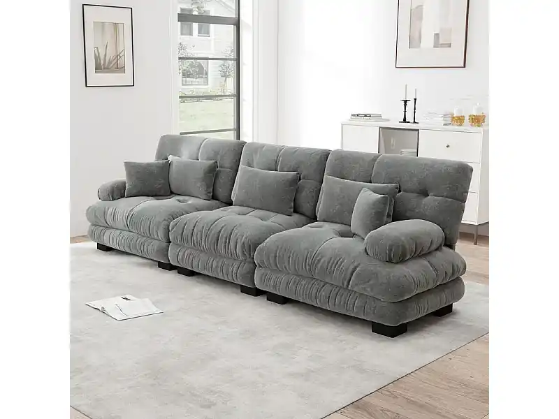 Preisreduziert Großes Sofa grau – 3-Sitzer – mit 5 Kissen – Massivholzgestell – Chenille – 313x77x81cm