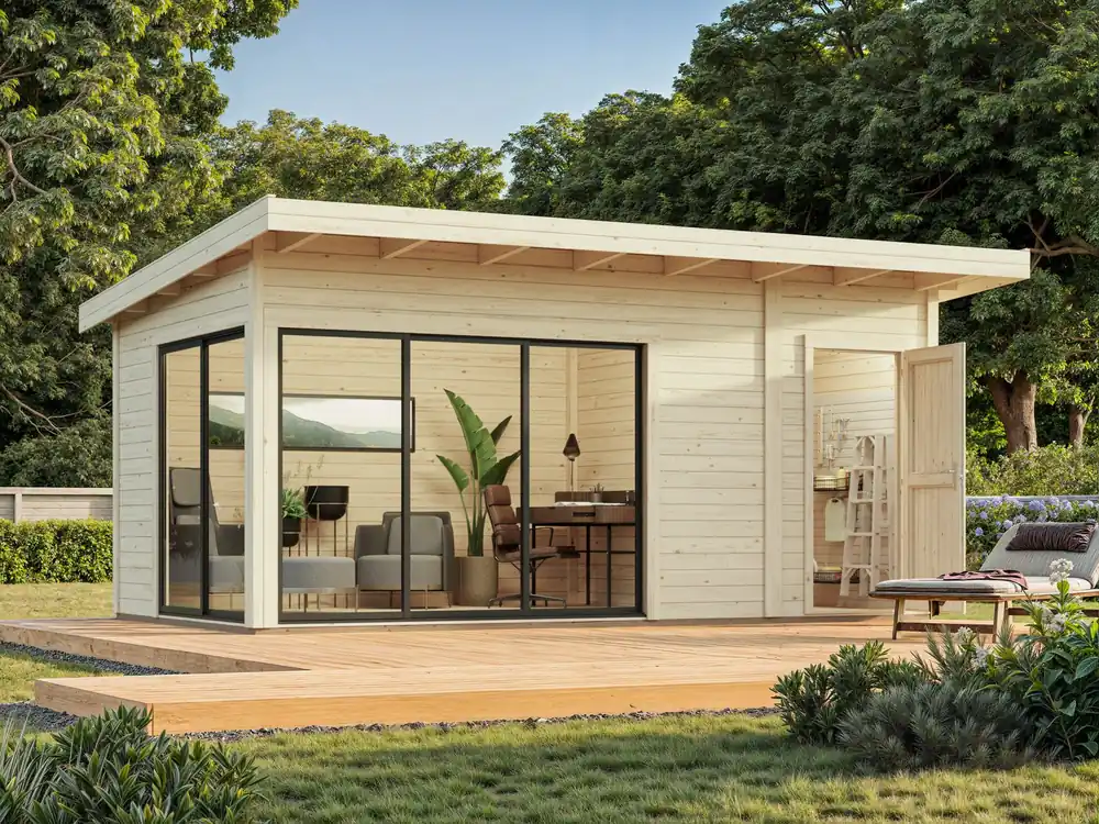 Das Pultdach Gartenhaus Andrea 15,2 m² Slide Plus ist ein zeitgemäßes Gartenhaus, das Ihren Außenbereich stilvoll ergänzt und funktional erweitert. Der 11,2 m² große Hauptraum bietet ausreichend Platz für Homeoffice, Studio, Gästezimmer oder einen persönlichen Rückzugsort. Ergänzt wird er durch einen praktischen 4,0 m² Geräteraum mit separatem Zugang, der zusätzlichen Stauraum für Gartenutensilien, Werkzeuge oder Freizeitbedarf schafft. Gefertigt aus hochwertiger nordischer Fichte, verfügt das Gartenhaus über 44 mm starke Wände mit modernen, verschraubten Eckverbindungen – für hohe Stabilität und ein klares, elegantes Erscheinungsbild. Das flache Dach fügt sich harmonisch in moderne Gartengestaltungen ein, während die abschließbaren Aluminium‑Schiebetüren mit 24 mm Doppelverglasung für erhöhte Sicherheit, bessere Isolierung und ein angenehmes Raumgefühl sorgen. Besonders praktisch: Die Bauweise ist umkehrbar, sodass das Gartenhaus flexibel an die Gegebenheiten Ihres Gartens angepasst werden kann. Damit vereint Andrea modernes Design, robuste Materialien und vielseitige Nutzungsmöglichkeiten – eine clevere und langlebige Investition für jeden Garten. Für den dauerhaften Schutz des naturbelassenen Holzes ist nach dem Aufbau eine Grundierung sowie eine abschließende Endbehandlung erforderlich.
