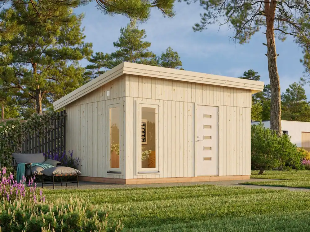 Ein modernes Pultdach sowie der nordische Charme machen das Element-Gartenhaus Etta zum neuen Mittelpunkt in Ihrem Garten – neben der Möglichkeit, darin fröhliche Abende in geselliger Runde zu verbringen bietet es sich alternativ auch zur ganzjährigen Nutzung als Homeoffice an! Die vorgefertigten Wandelemente sind mit einer Dampfbremsfolie sowie einem 18 mm starken und sägefeinen Fassadenbrett versehen. Diese Elementbauweise erlaubt eine problemlose und schnelle Montage. Innen können die Wandelemente mit einer bis zu 70 mmm starken Isolierung versehen werden, die auch Versorgungsleitungen aufnehmen. Die Elementrahmen werden aus 34×70 mm starken nordischen Fichte Hölzer gefertigt und ergeben mit dem Fassadenbrett eine Gesamtstärke von 88 mm. Geliefert wird das Gartenhaus mit einem stabilen 19 mm starken Fußboden, Dachbrettern, sowie nach außen öffnenden Fenstern und einer Tür, die mit Iso-Glas versehen sind. Die Eingangstür besteht aus einem Leimholzrahmen und erhält zusätzlich eine EPS Isolierung. Das Einsteckschloss, der Profilzylinder und die Drückergarnitur sind im Lieferumfang enthalten. Den eigenen Touch können Sie durch die individuelle Anordnung der Fenster und Tür erreichen. Das Haus steht auf kesseldruckimprägnierten Hölzern, ein Montageset wird mitgeliefert. Die sägefeinen Fassadenbretter sind naturbelassen und daher ideal für farbige Anstriche. Dacheindeckung nicht im Lieferumfang enthalten.