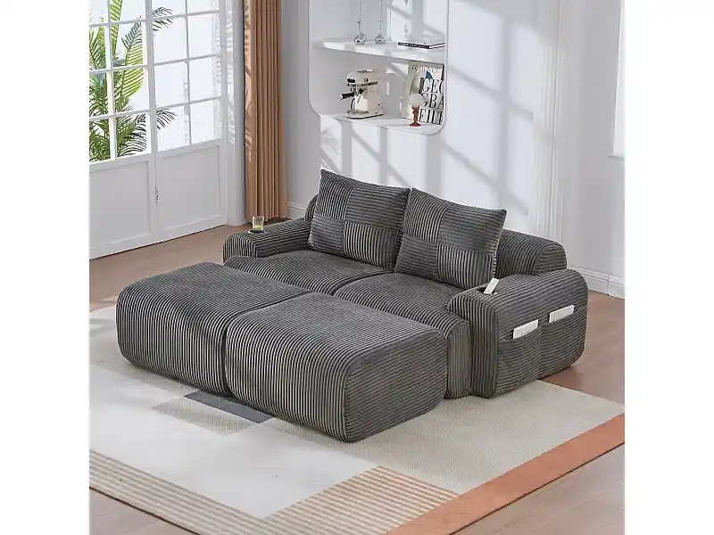 Versand Am Gleichen Tag Modulares Ecksofa Rippensamt, Getränkehalter, 2 Hocker und 2 Kissen, 200x174x80cm, Anthrazit